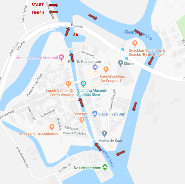 Onderstaand een routekaartje van het rondje, in en rondom Sloten, die de dames gaan zwemmen. Het rondje is 1 kilometer lang en moet dus 2x gezwommen worden.