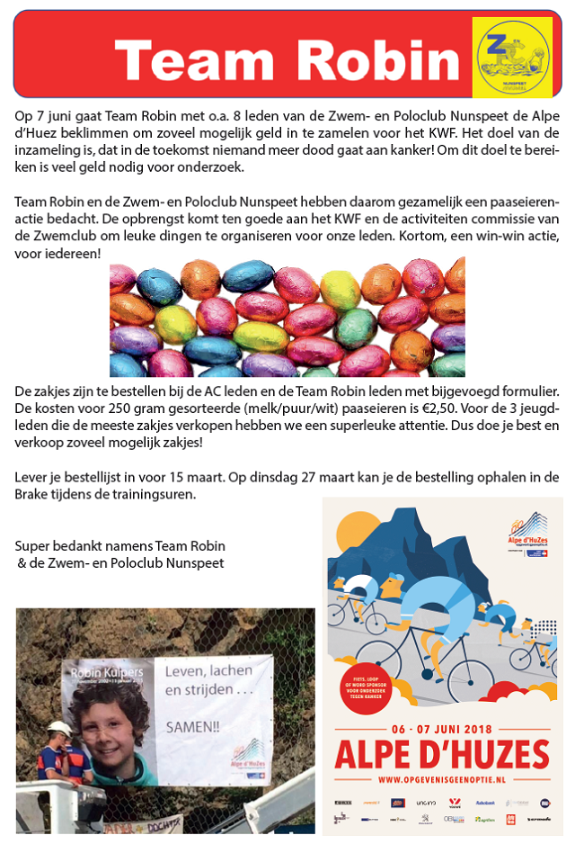 Om geld in te zamelen voor het KWF doet team Robin op 7 juni as. mee om de Alpe d’Huez te beklimmen. Team Robin bestaat o.a. uit 8 leden van onze club.