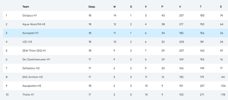 Door dit resultaat eindigt Nunspeet deze competitie op een mooie 3e plaats. Voor de mannen is het seizoen nog niet helemaal afgelopen. Op zaterdag 16 mei aanstaande spelen ze in zwembad De Wiltsangh de Interregionale Bekerfinale tegen De Grunte uit Hardenberg.