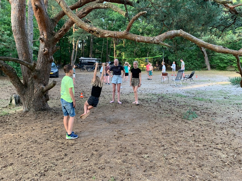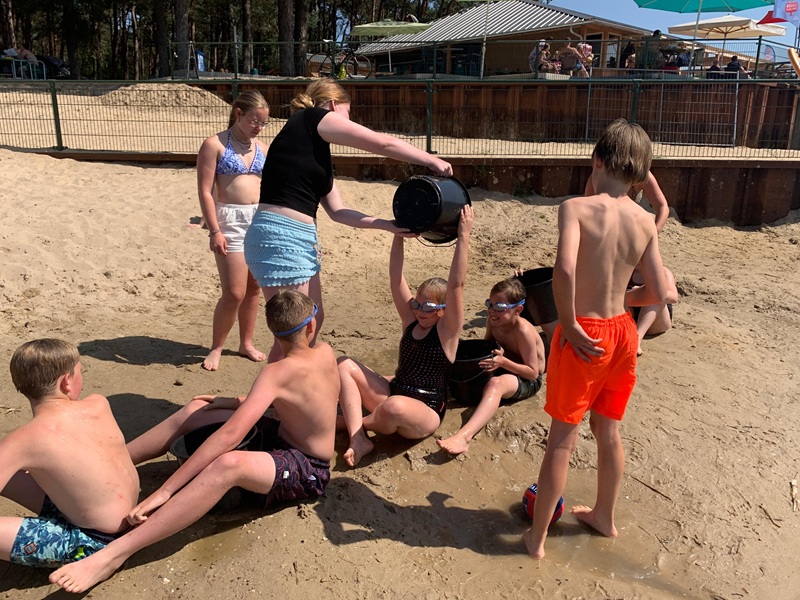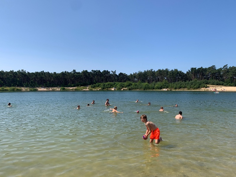 Na een lange, gezellige, bij vlagen onrustige nacht hebben we het kamp met elkaar afgesloten met een bezoek aan de Zandenplas. Heerlijk zwemmen, spelen en een balletje gooien.