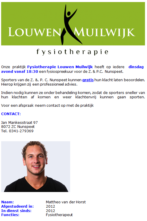 Algemeen Gratis Fysiospreekuur voor onze leden Gert Ponsteen 8 april 2014 1 min. lezen 353 Fysiotherapie Louwen Muilwijk heeft op iedere dinsdagavond vanaf 18:30 een fysiospreekuur voor de Z. & P.C. Nunspeet. Doorgaan met lezen Vorige Vorig bericht: Mike Marissen ook op het land nu sneller!Volgende Volgende bericht: Mike Marissen teleurgesteld over optreden Eindhoven Swimcup Gerelateerd nieuws Aanstaand weekend barst de Strijd om de Nunspeetse Keiler los 8 juni 2025 742 Clinics voor de Nunspeetse schooljeugd 10 maart 2025 458 Nu trending 1 Nunspeet tegen Apeldoorn voor de halve finale beker 28 januari 2026 128 2 Degelijke overwinning voor Nunspeet 25 januari 2026 243 3 Onze jongens naar de halve finale beker 20 januari 2026 239 4 Wil jij ons helpen? 12 januari 2026 210