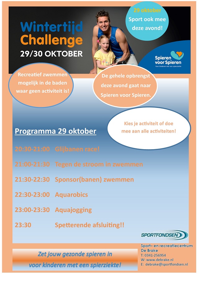 Op zaterdag 29 oktober as. organiseert zwembad De Brake van 20.30u – 23.30u (na de waterpolowedstrijden) een WINTERTIJD CHALLENGE, het doel hiervan is om geld in te zamelen voor Spieren voor Spieren.