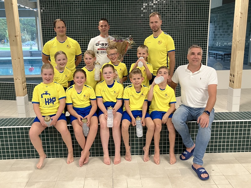 Nadat de teamfoto voor de waterpolo pagina was gemaakt, hebben we ook een foto gemaakt met het team en de nieuwe sponsor van onze club.