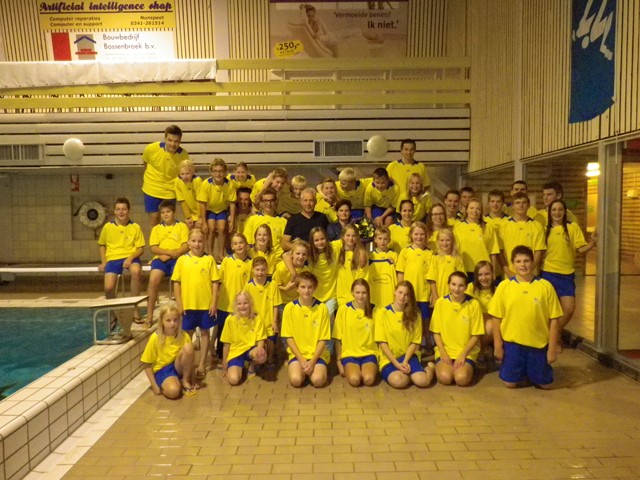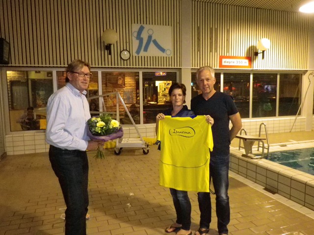 Namens de sponsorcommissie bedankte Jan Kamp de familie Jorna met een bloemetje, daarna was het tijd om met de voltallige zwemselectie op de foto te gaan.