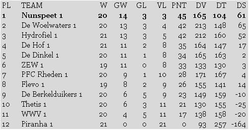 Nunspeet 1 verliest as. zaterdag 13 april maar wint op zaterdag 20 april van Hydrofiel 1: Nunspeet 1 Kampioen, De Woelwaters 1 kunnen nog in punten gelijk komen maar het onderlinge resultaat, 2x winst, is in het voordeel van Nunspeet 1.