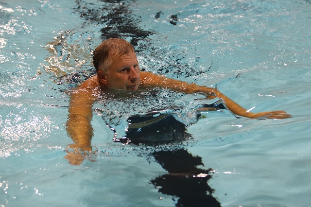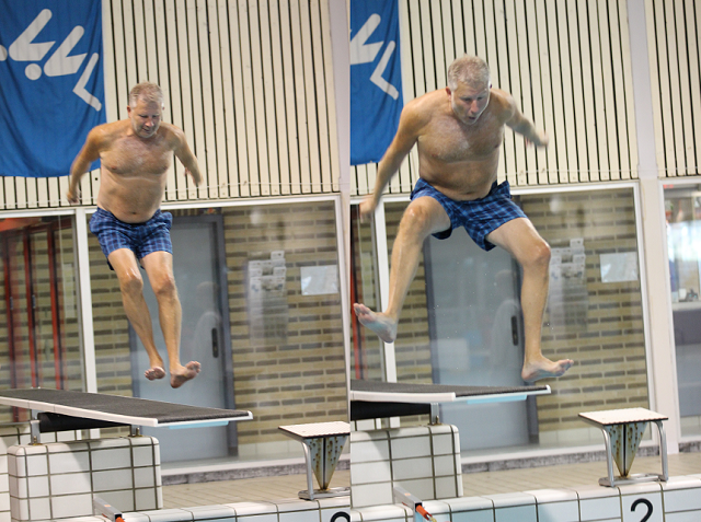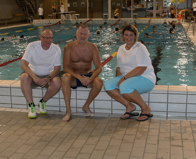 Met een ferme duik van de duikplank dook loco-burgemeester Gert van den Berg als eerste in het water van zwembad De Brake en opende op die manier de 2e Nunspeetse zwem4daagse.