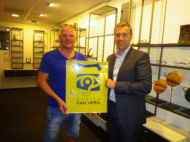 Namens de sponsorcommissie bracht Gert Ponsteen een bezoekje aan de nieuwe winkel en verraste eigenaar Hendri van Veen met een ingelijst shirt.