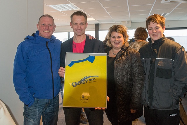 Namens de sponsorcommissie heeft Gert Ponsteen een ingelijst sponsorshirt aangeboden die vast een mooi plekje zal vinden in de sportschool.