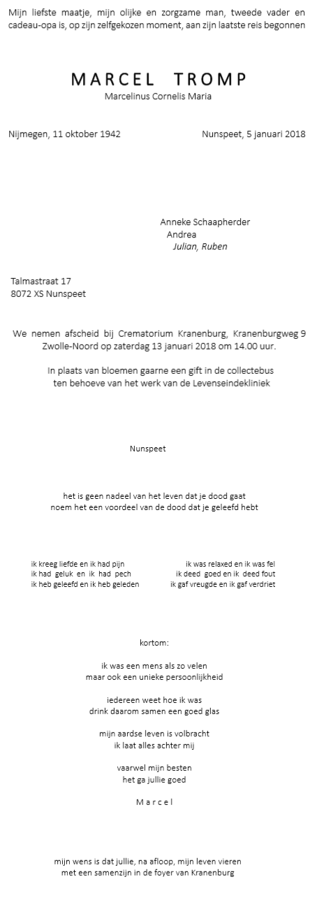 Gisteravond hebben we een overlijdenskaart ontvangen van Marcel Tromp