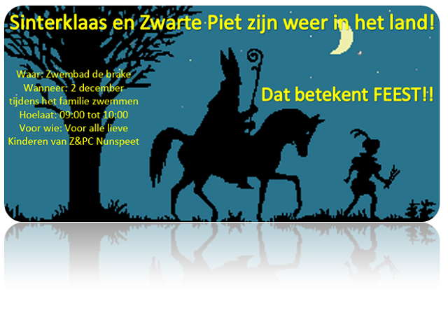 Algemeen Sint en Piet in zwembad De Brake Gert Ponsteen 14 november 2017 1 min. lezen 605 Op zaterdag 2 december as. brengen Sint en zijn Pieten tijdens het familiezwemmen (van 09.00u – 10.00u) een bezoek aan zwembad De Brake. Zorg dat je er bij bent. Als je wilt mag je op de foto met Sint en Piet. Doorgaan met lezen Vorige Vorig bericht: Brigit Mulder maakt overstap naar de California Golden BearsVolgende Volgende bericht: WCARE ICT sponsor wedstrijdbal Nunspeet H3 – Swol 1894 H3 Gerelateerd nieuws Aanstaand weekend barst de Strijd om de Nunspeetse Keiler los 8 juni 2025 801 Clinics voor de Nunspeetse schooljeugd 10 maart 2025 487 Nu trending 1 Nunspeet knokt zich langs ZEW-Triton 1 februari 2026 294 2 Nunspeet tegen Apeldoorn voor de halve finale beker 28 januari 2026 263 3 Degelijke overwinning voor Nunspeet 25 januari 2026 367 4 Onze jongens naar de halve finale beker 20 januari 2026 364