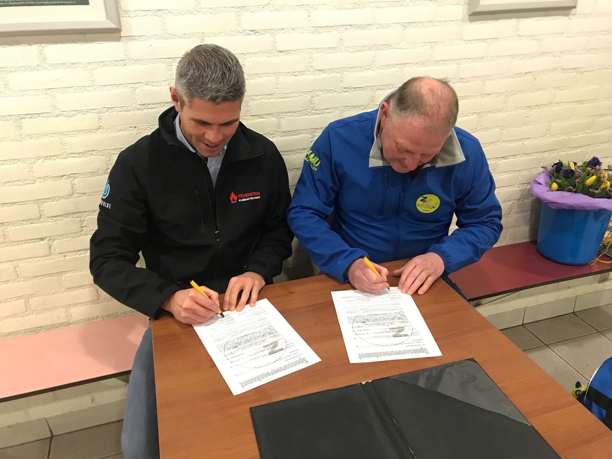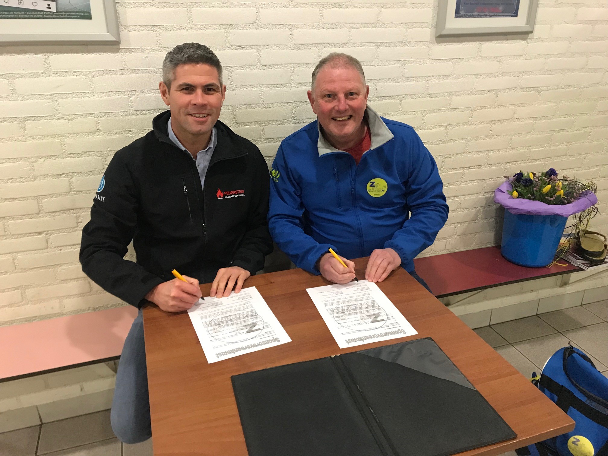 Gisteravond hebben Robert van Rossum namens Technisch Bureau Feuerstein en Gert Ponsteen namens de sponsorcommissie een handtekening gezet onder een 5-jarig sponsorcontract. Door Corona was de ondertekening van het contract al een aantal malen uitgesteld. Feuerstein is de teamsponsor van ons Heren 4 team. Als dank voor de sponsoring ontving Robert namens de sponsorcommissie een mooie bos bloemen in de geel-blauwe kleuren.