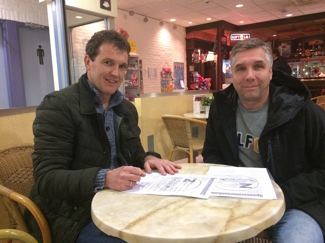 Edwin van Beekhuizen (namens van Beekhuizen Controlling) en Erwin Kuipers (namens de sponsorcommissie) hebben het 3-jarige contract ondertekend in zwembad De Brake.