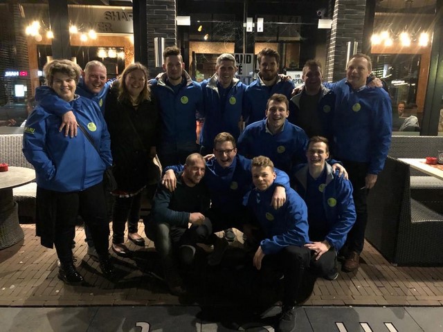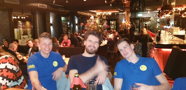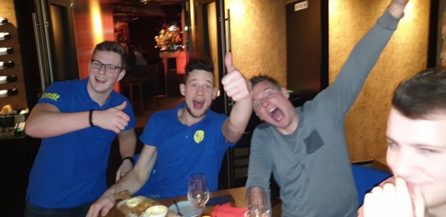 Het nieuws dat we kwamen was al bekend bij de aanwezige gasten. Toen we binnen kwamen stopten de gesprekken aan de tafeltjes en werden we ontvangen met een luid applaus en gejuich. Toen we naar onze tafel liepen kregen we veel schouderklopjes en werden we gefeliciteerd met de overwinning op de plaatselijke waterpolo trots.