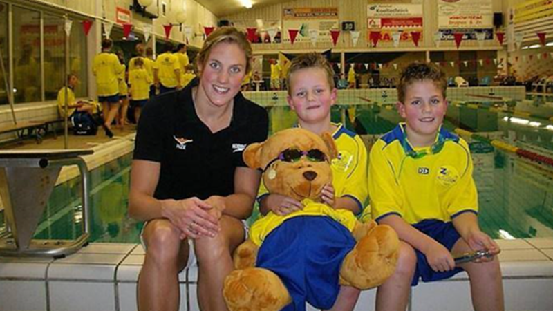 Noot van de redactie: Het is niet de eerste keer dat een top zwemster een clinic verzorgd bij onze club. In 2007 was Marleen Veldhuis te gast in zwembad De Brake. Natuurlijk moest ze toen even op de foto met onze mascotte Limietje.