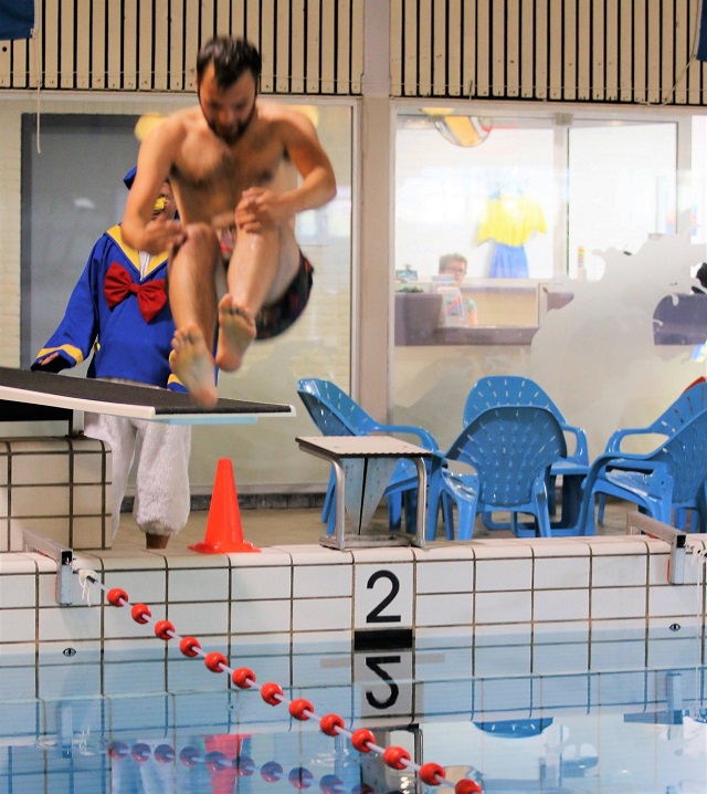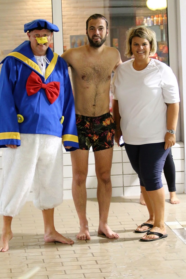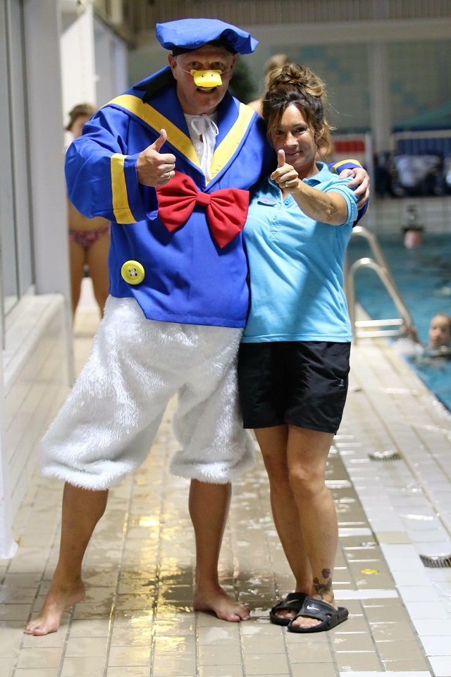 Donald Duck was ook van de partij en moedigde de deelnemers aan om hun baantjes te zwemmen.