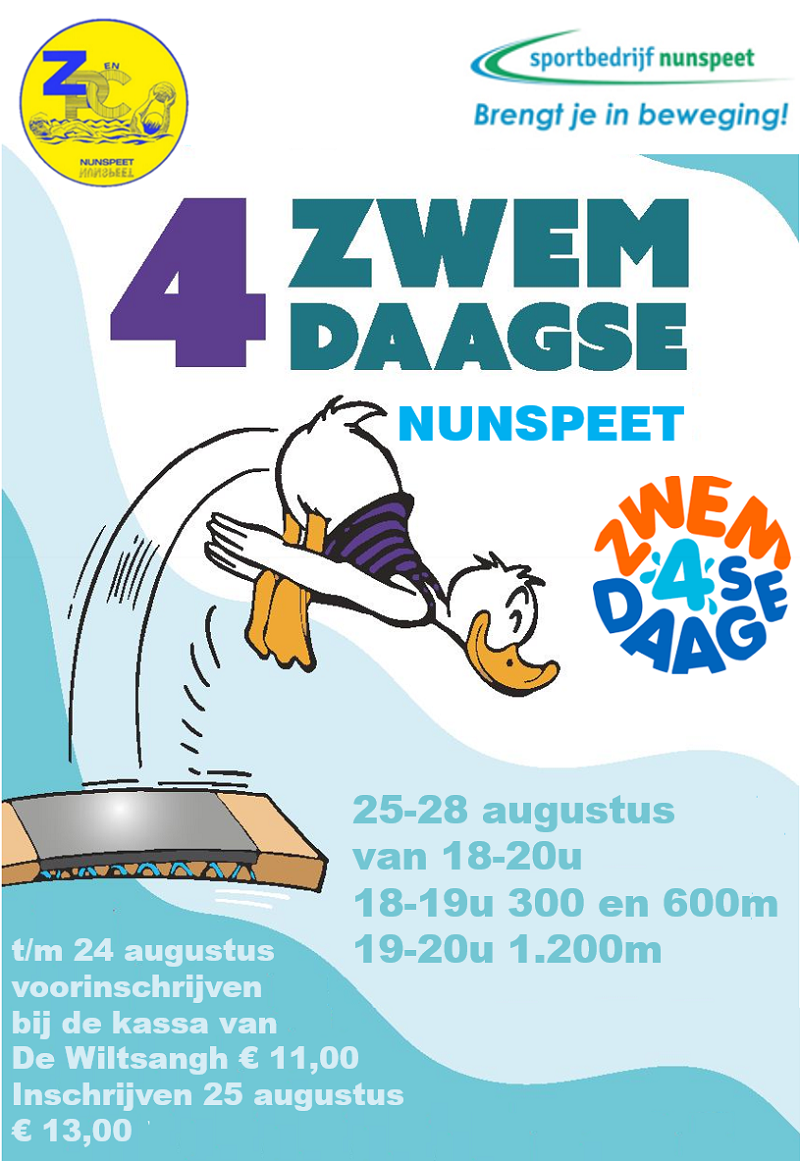 Van maandag 25 augustus tot en met donderdag 28 augustus 2025, de laatste week van de zomervakantie in onze regio, organiseert de Zwem en Polo Club Nunspeet in samenwerking met Sportbedrijf Nunspeet voor de 8e keer de Zwem4daagse in Nunspeet.